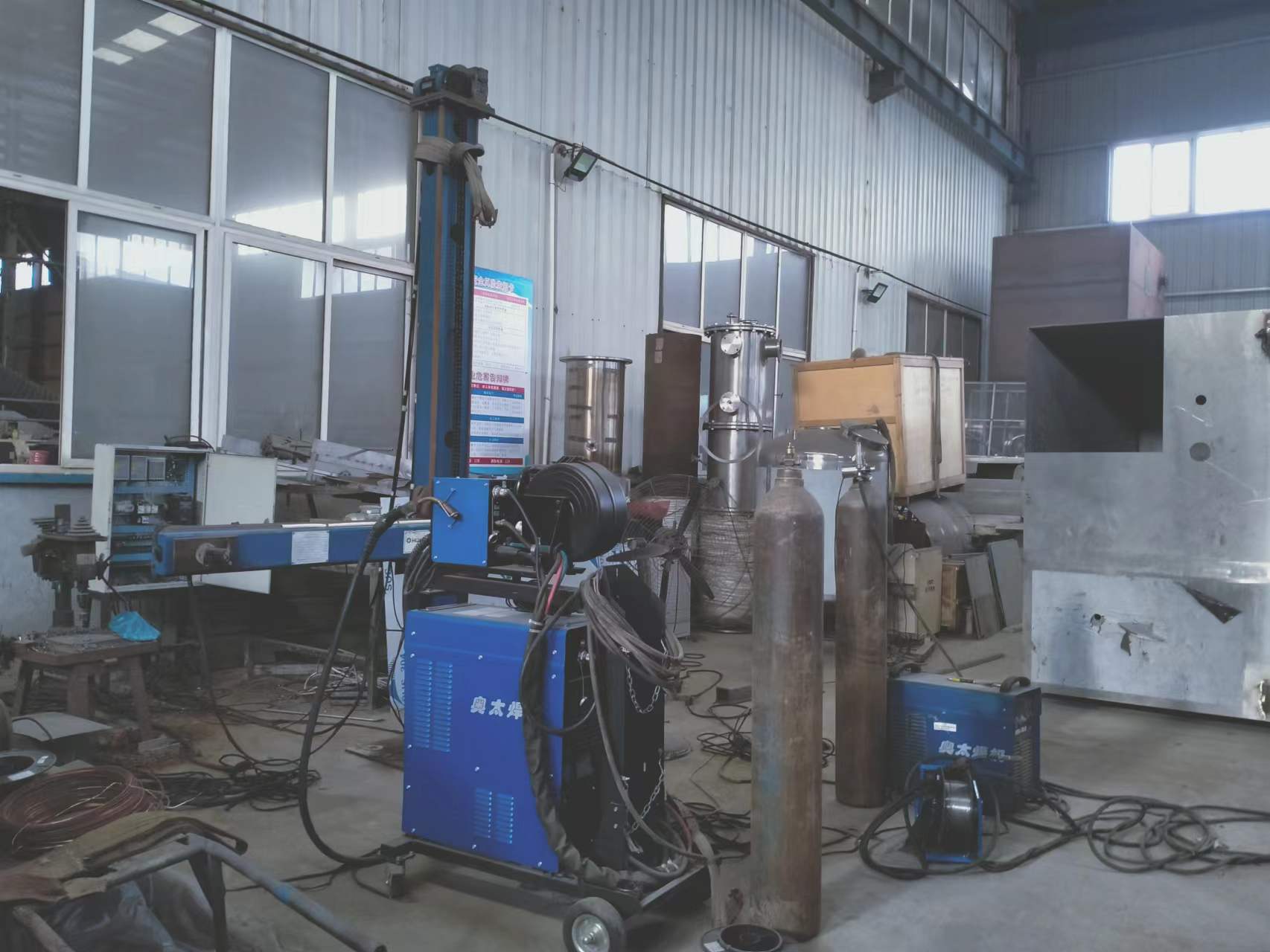 焊縫、縱縫自動焊機、等離子切割機、卷板機、封頭拋光機、滾筒拋光機等多種現代化智能生產設備。